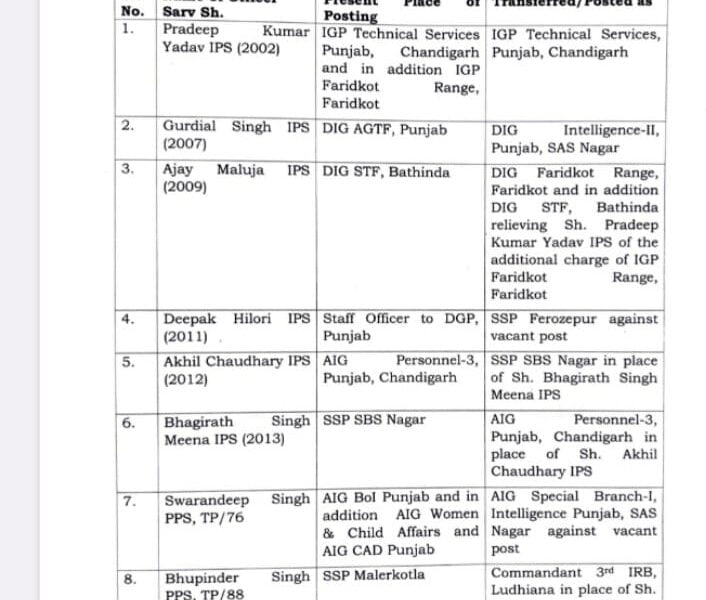 ਚੰਡੀਗੜ੍ਹ 17 ਜੁਲਾਈ (ਦਿਵਿਆ ਸਵੇਰਾ ਟੀਮ) ਪੰਜਾਬ ਸਰਕਾਰ ਵੱਲੋਂ ਪੁਲਿਸ ਪ੍ਰਸਾਸ਼ਨ ਵਿੱਚ ਵੱਡਾ ਫੇਰਬਦਲ, ਸੂਬੇ ਭਰ ਦੇ 17 ਉੱਚ ਅਧਿਕਾਰੀਆ ਦੇ ਕੀਤੇ ਗਏ ਤਬਾਦਲੇ। ਜਿਨ੍ਹਾਂ ਵਿੱਚ...