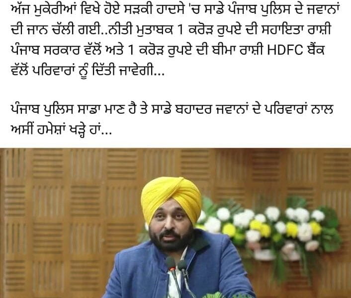 ਮੁੱਖ ਮੰਤਰੀ ਭਗਵੰਤ ਸਿੰਘ ਮਾਨ ਨੇ ਕੀਤਾ ਐਲਾਨ ਮੁਕੇਰੀਆਂ (ਦਿਵਿਆ ਸਵੇਰਾ) ਮੁਕੇਰੀਆਂ ਬੁੱਧਵਾਰ ਨੂੰ ਹੁਸ਼ਿਆਰਪੁਰ ਨਜਦੀਕ ਹੋਏ ਸੜ੍ਹਕ ਹਾਦਸੇ ‘ਚ ਪੁਲਿਸ ਮੁਲਾਜ਼ਮਾਂ ਦੀ ਮੌਤ ਤੇ ਗਹਿਰੇ...
